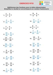 Le premier exercice comprend 20 additions de fractions pour lesquels les dénominateurs sont égaux. Aucune simplification ou conversion n’est demandée.