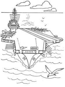 D’abord, n’hésitez pas à colorier toutes les pistes en gris foncé, puis le tour de contrôle et le bas du porte-avion en gris clair. Ensuite, vous devez tracer les marquages au sol en rouge et blanc, et le bulbe d’étrave du navire en rouge. Et pour terminer, vous pouvez orner les avions stationnés sur le pont en beige.