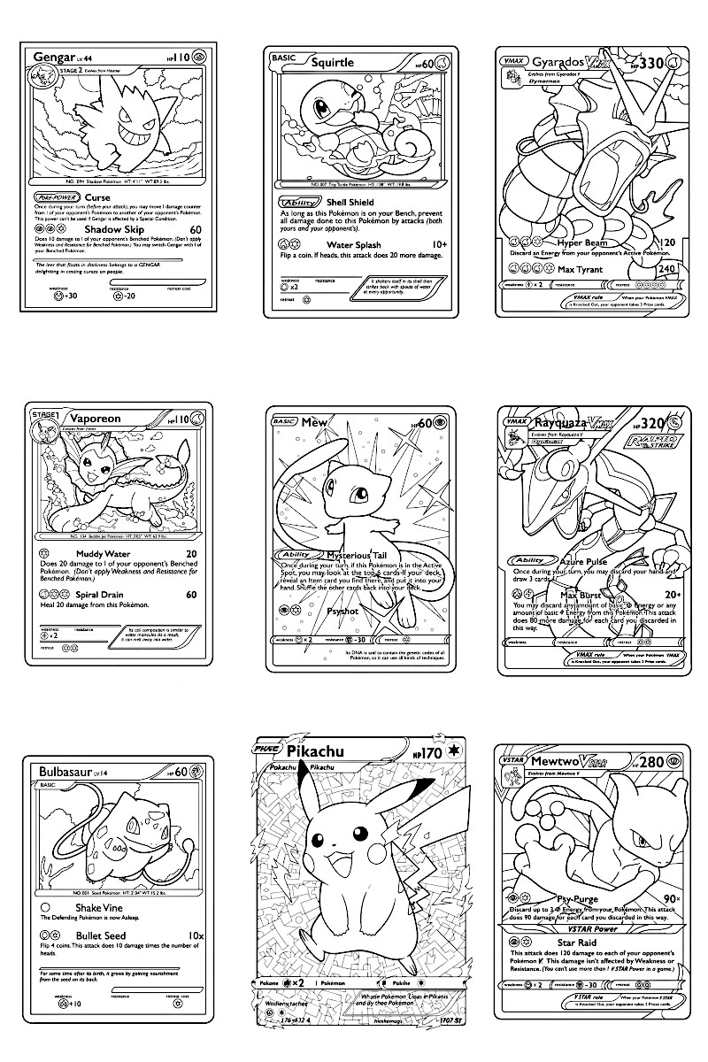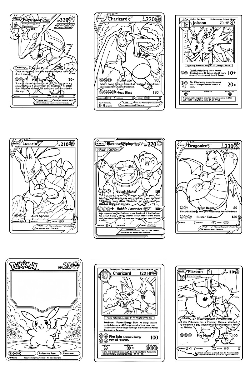 Ce livre PDF unique rassemble de nombreuses cartes Pokémon à colorier, avec une grande variété de personnages emblématiques : Pikachu, Mewtwo, Gyarados, Rayquaza, Evoli, Dracaufeu, Lucario, Tortank et bien d’autres encore !