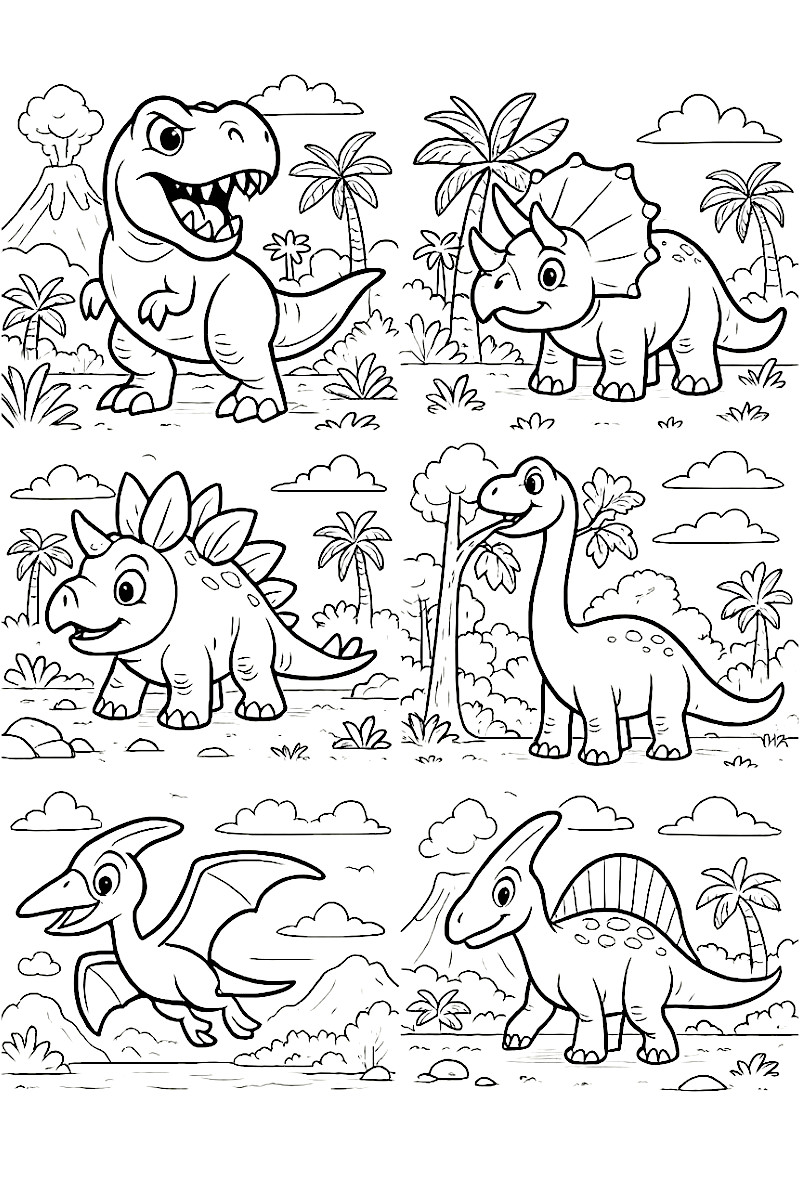 Ce coloriage Dinosaure Enfant réunit sur une même page six adorables dinosaures, chacun dans son environnement naturel. Vous y trouverez un T-Rex, un Tricératops, un Stégosaure, un Brachiosaure, un Ptéranodon et un Spinosaure. Tous ont été dessinés avec un air heureux et souriant pour que le dessin reste ludique et bienveillant, sans aucun aspect effrayant.