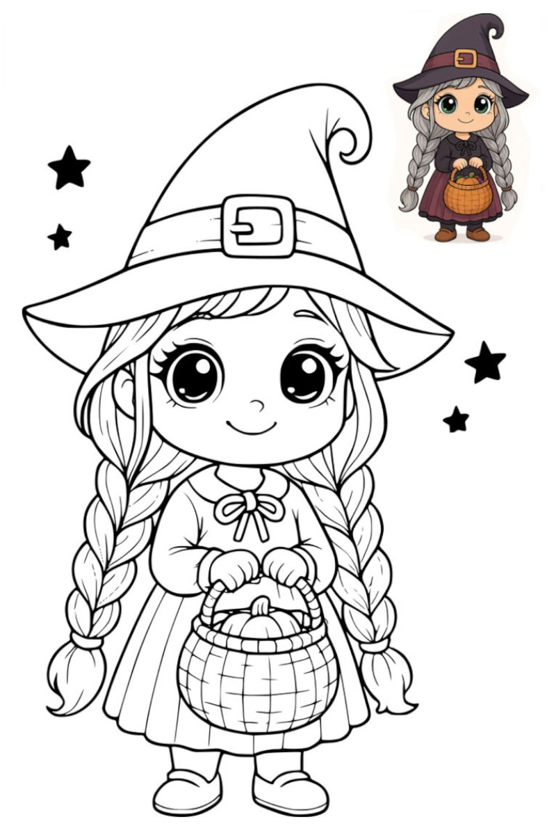 Faites découvrir à vos enfants la magie d’Halloween avec ce charmant coloriage kawaii fille Halloween ! On y voit une adorable petite sorcière au grand chapeau pointu, un panier de citrouilles à la main et un immense sourire plein de malice.