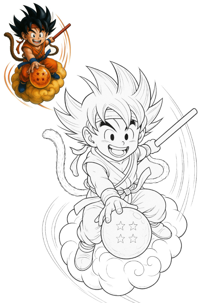 Ce coloriage San Goku est plein de nostalgie et de tendresse, parfait pour faire découvrir aux enfants les débuts de la saga Dragon Ball. Grâce au modèle coloré, ils pourront facilement choisir les bonnes couleurs avant de colorier la version noir et blanc.