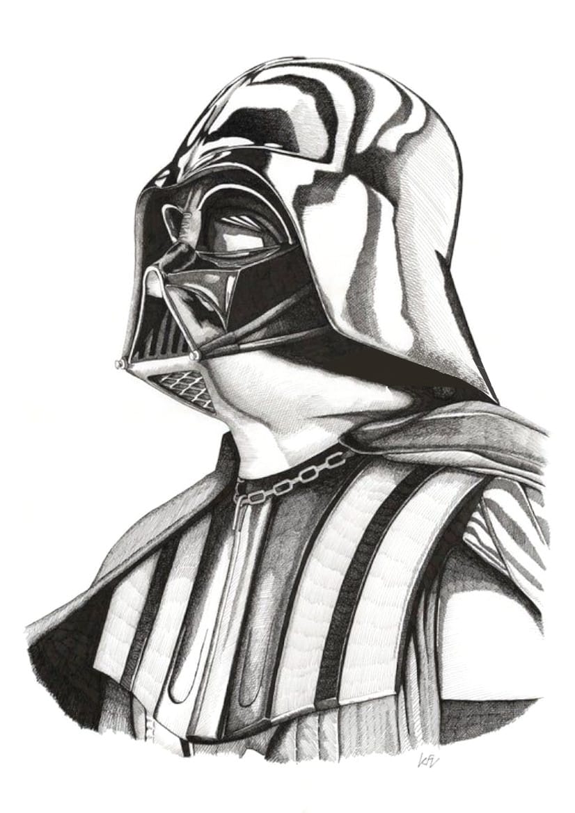 L’armure de ce personnage culte est principalement noire, mais pour éviter un rendu trop plat, jouez sur les contrastes : utilisez un noir profond pour les parties les plus sombres et des nuances de gris métallique pour donner du relief au casque et à la poitrine.