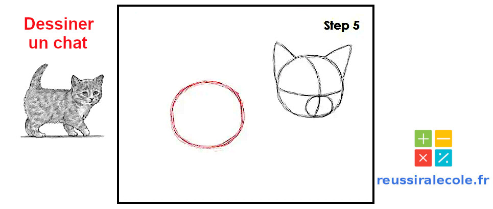 Notre tuto de dessin chat facile se poursuit en traçant un second cercle pour esquisser le corps du chat. Ce dernier doit être plus grand que la tête, et il doit être aligné avec la partie inférieure des oreilles du chaton.