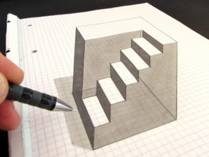 Ce premier tuto permet d’apprendre à dessiner un escalier en perspective. Ce type d’image est facile à réaliser et nous vous conseillons de commencer par ce type d’illusion.