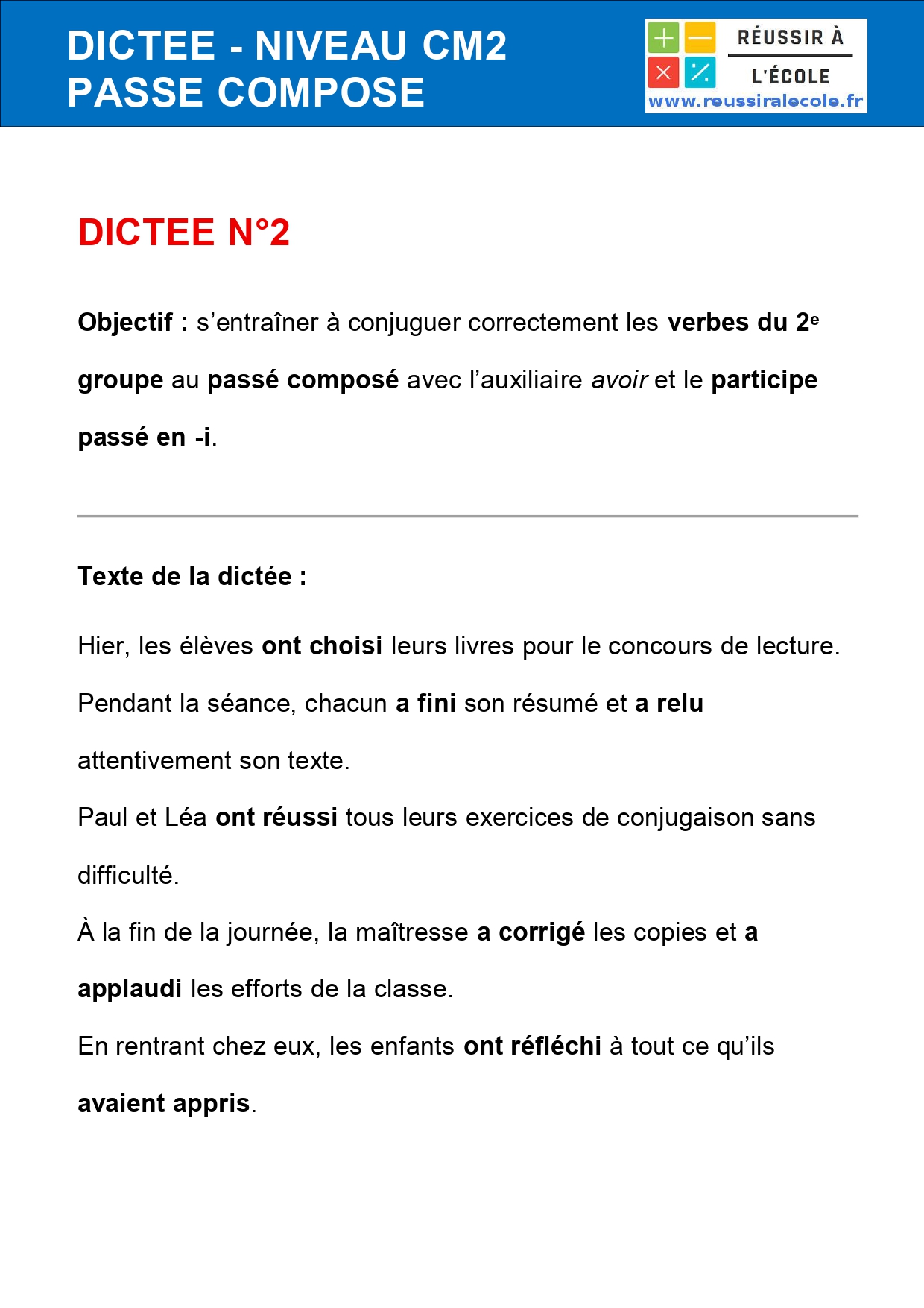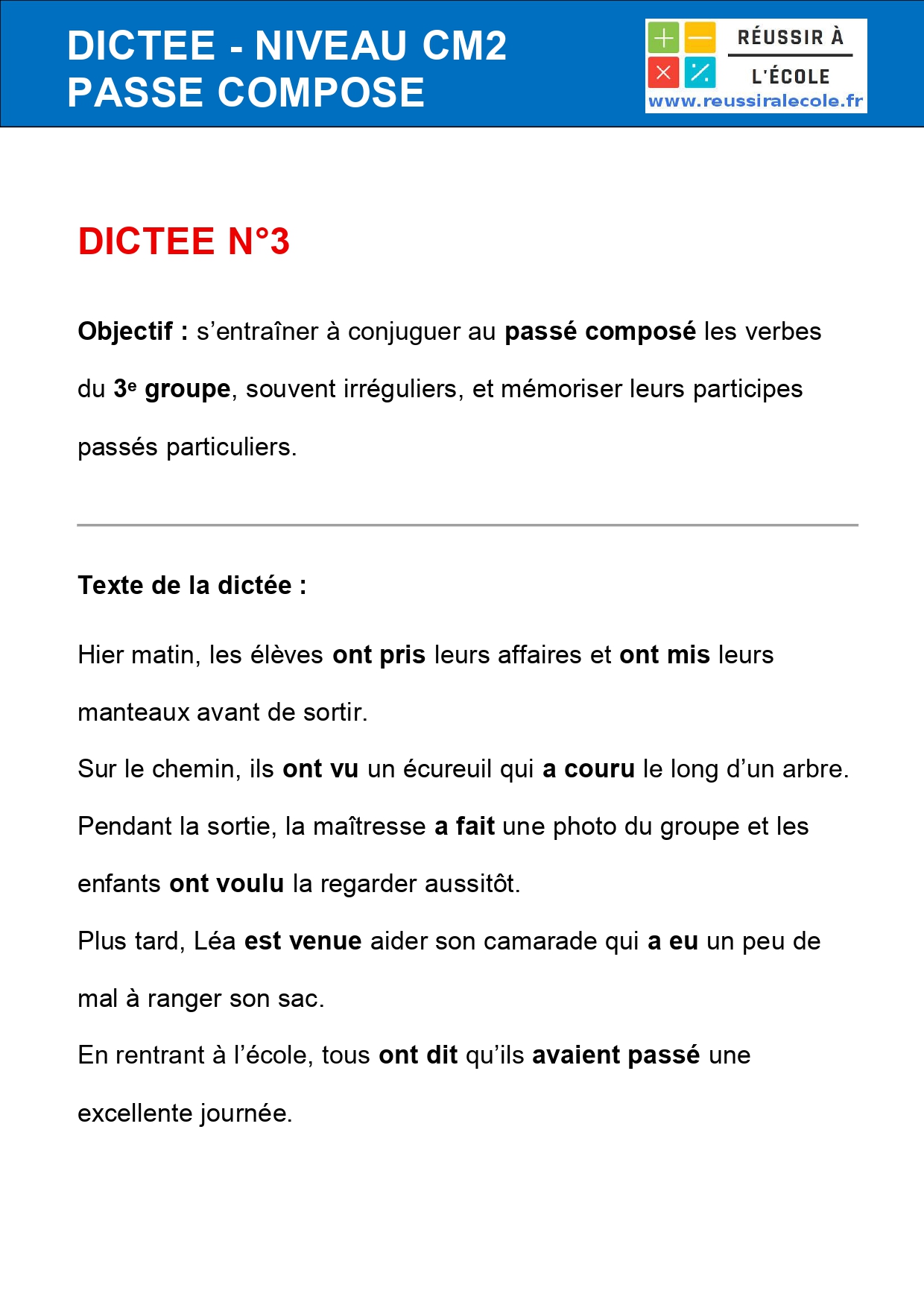 Ces dictées pour élève en CM2 sur le passé composé sont disponibles au format PDF : il suffit de cliquer sur le lien correspondant pour choisir entre impression immédiate ou téléchargement.