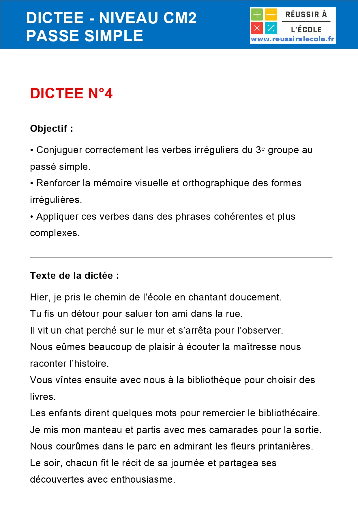 Dans ce quatrième chapitre, vous pourrez télécharger et imprimer une dictée niveau CM2 sur le passé simple des verbes du troisième groupe. Son intérêt pédagogique est double : familiariser les élèves avec les irrégularités des verbes tout en renforçant leur mémoire visuelle et orthographique des formes du passé simple.
