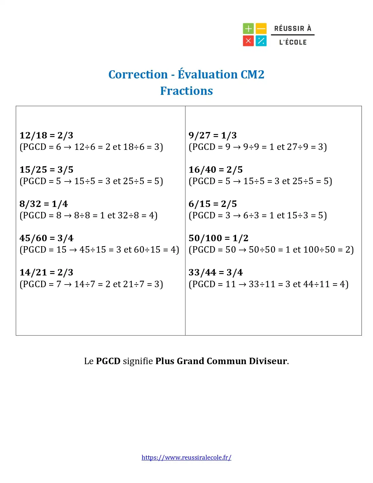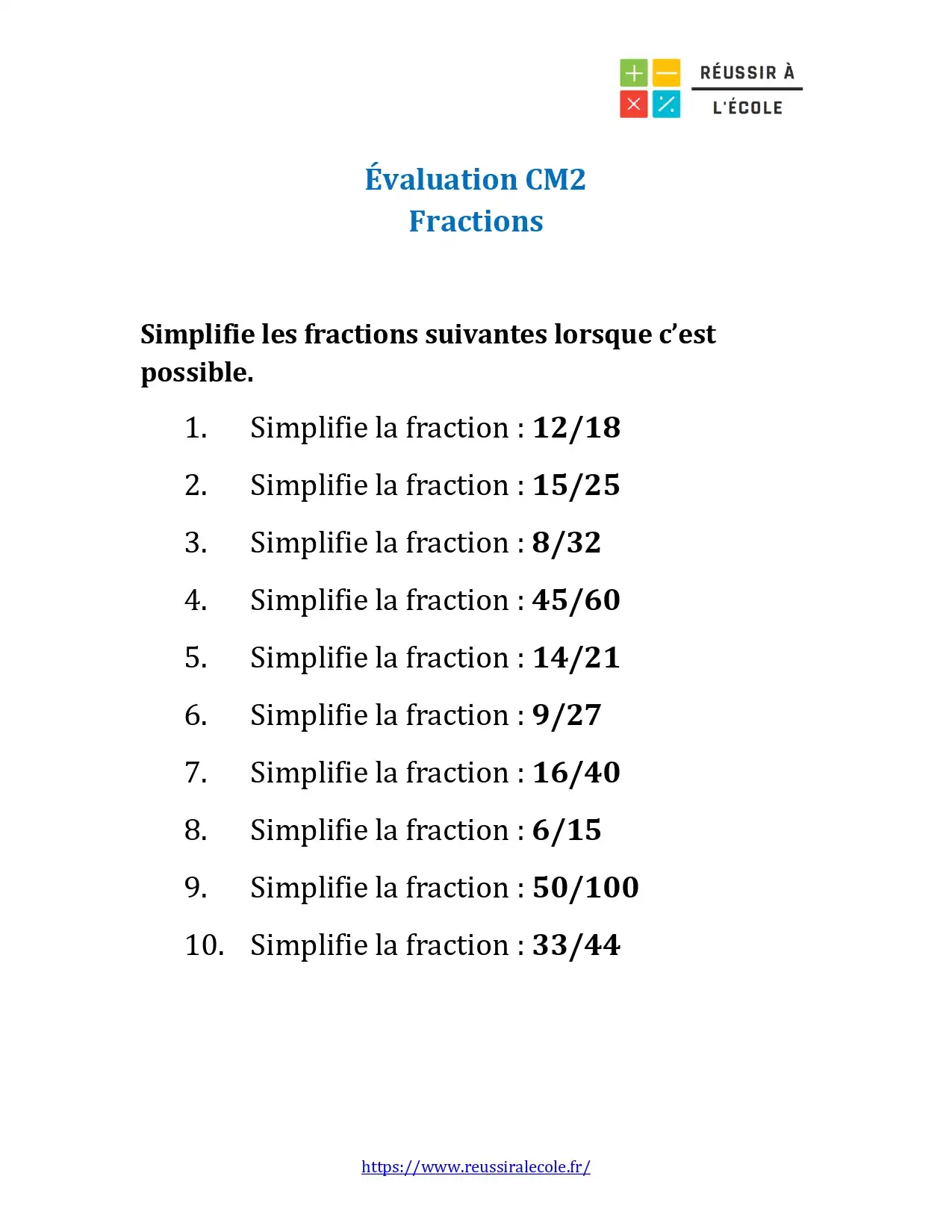 Evaluation Fraction CM2 – exercice sur la simplification de fractions