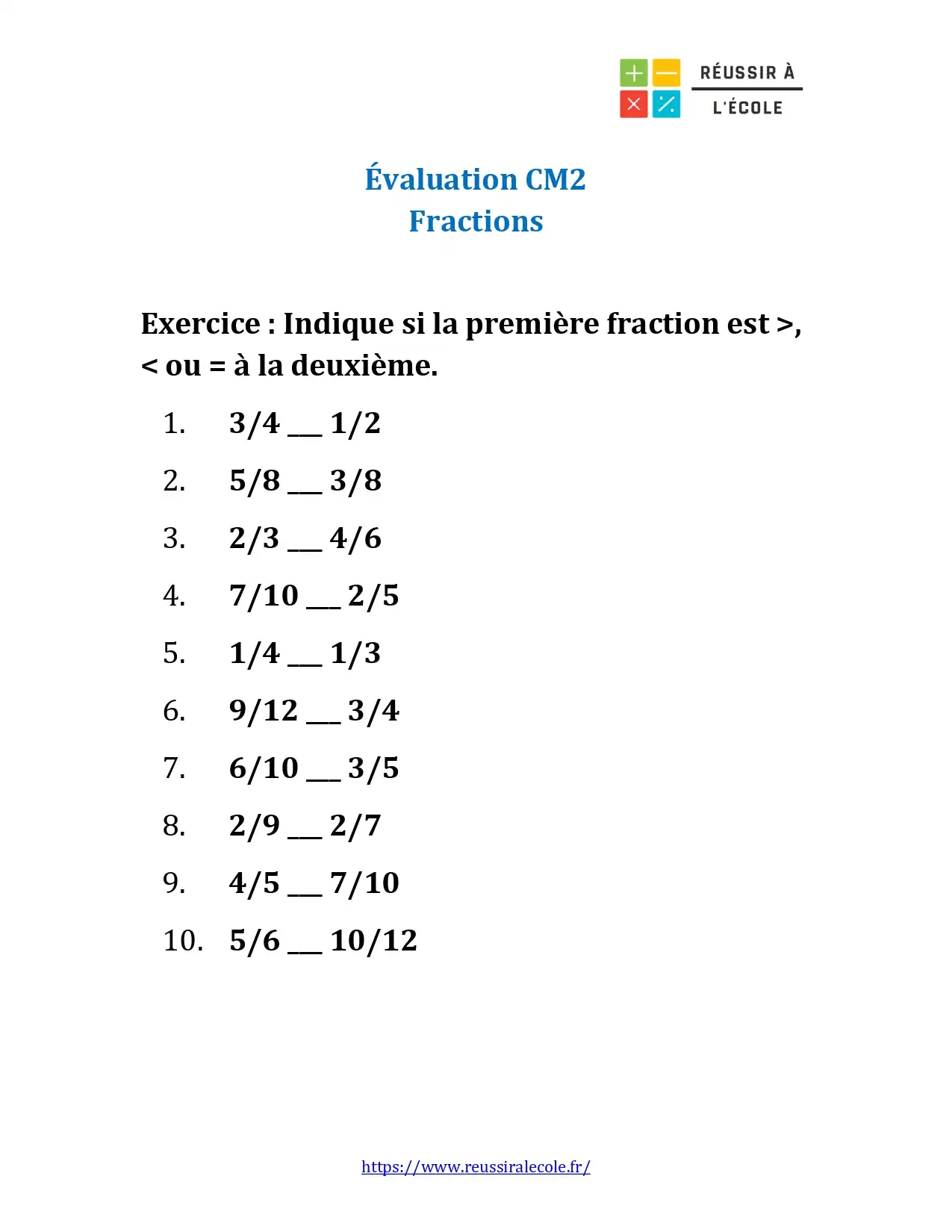 Evaluations Fractions CM2 – exercice pour comparer des fractions