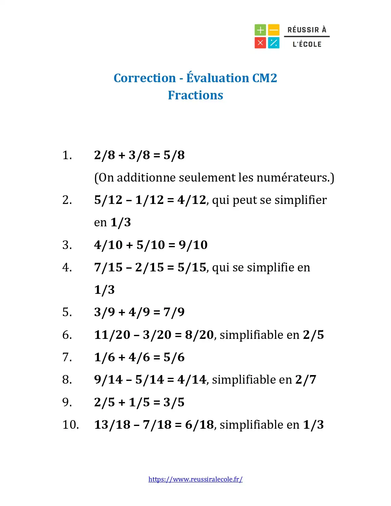Dans cette evaluation niveau CM2, l’élève réalise des opérations comme 2/8 + 3/8 ou 5/12 – 1/12, puis vérifie ses résultats grâce à la correction fournie.