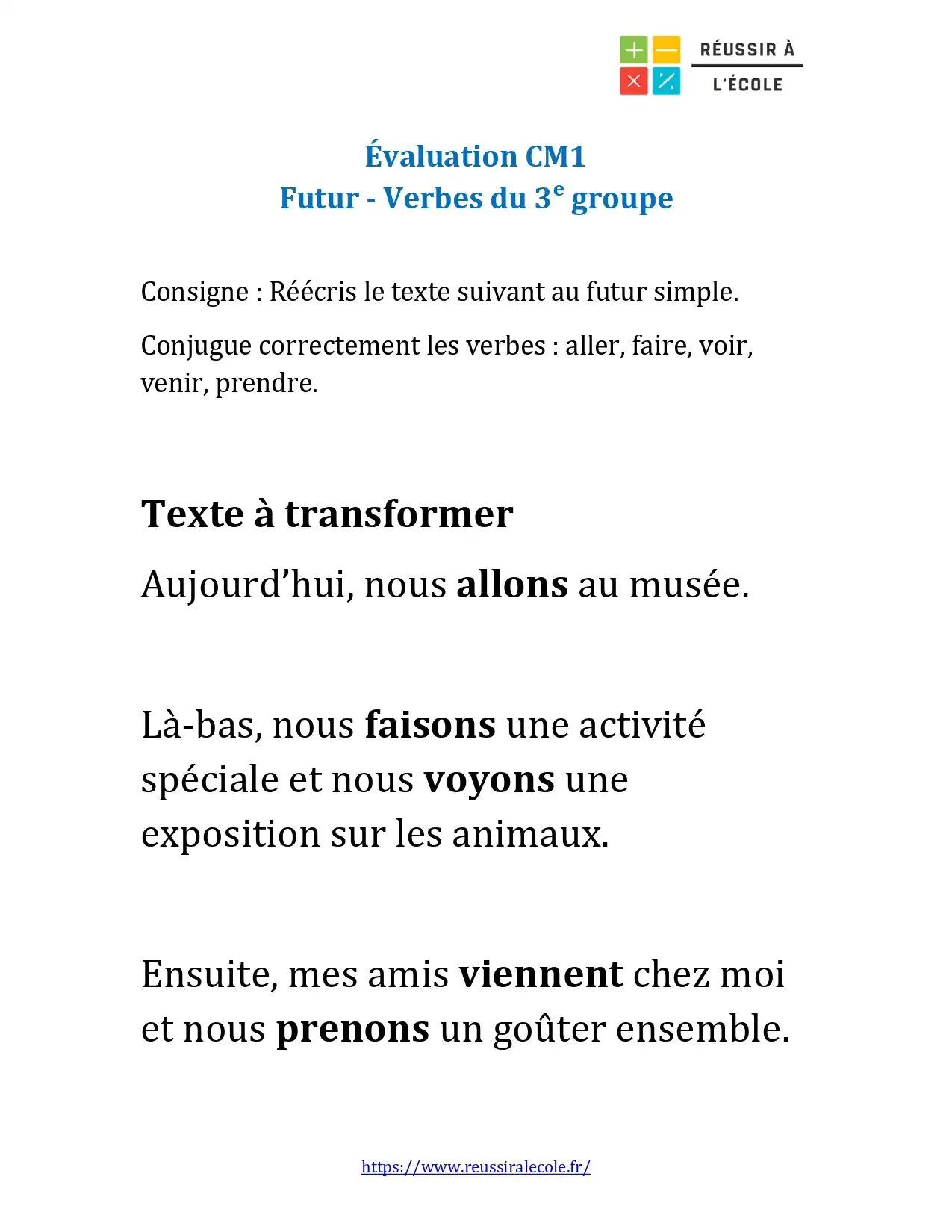 Notre evaluation niveau CM1 sur la conjugaison du futur est un travail de transformation. L’élève doit réécrire un petit paragraphe au futur simple, en mettant au futur les verbes aller, faire, voir, venir et prendre.