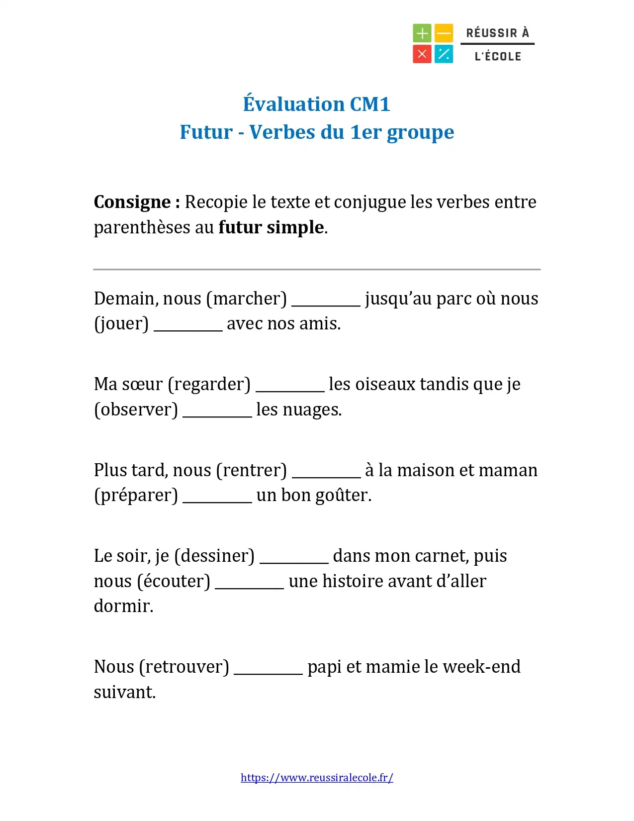Dans ce deuxième chapitre, vous pouvez télécharger une fiche centrée sur les verbes du 1er groupe. Cette fois-ci, l’évaluation niveau CM1 consiste à conjuguer dix verbes en er au futur simple dans un court texte. Les verbes sont indiqués entre parenthèses, et l’élève doit les replacer correctement en respectant la terminaison du futur.