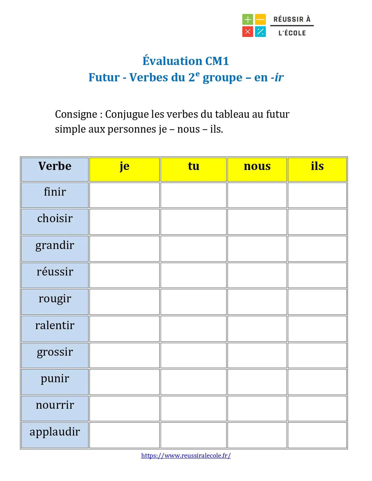 Dans ce troisième chapitre, nous vous invitons à télécharger un exercice portant sur les verbes du 2e groupe. Cet évaluation niveau CM1 consiste à conjuguer au futur dix verbes réguliers en ir. L’élève doit remplir les cases correspondant aux pronoms personnels je, nous et ils au futur simple.