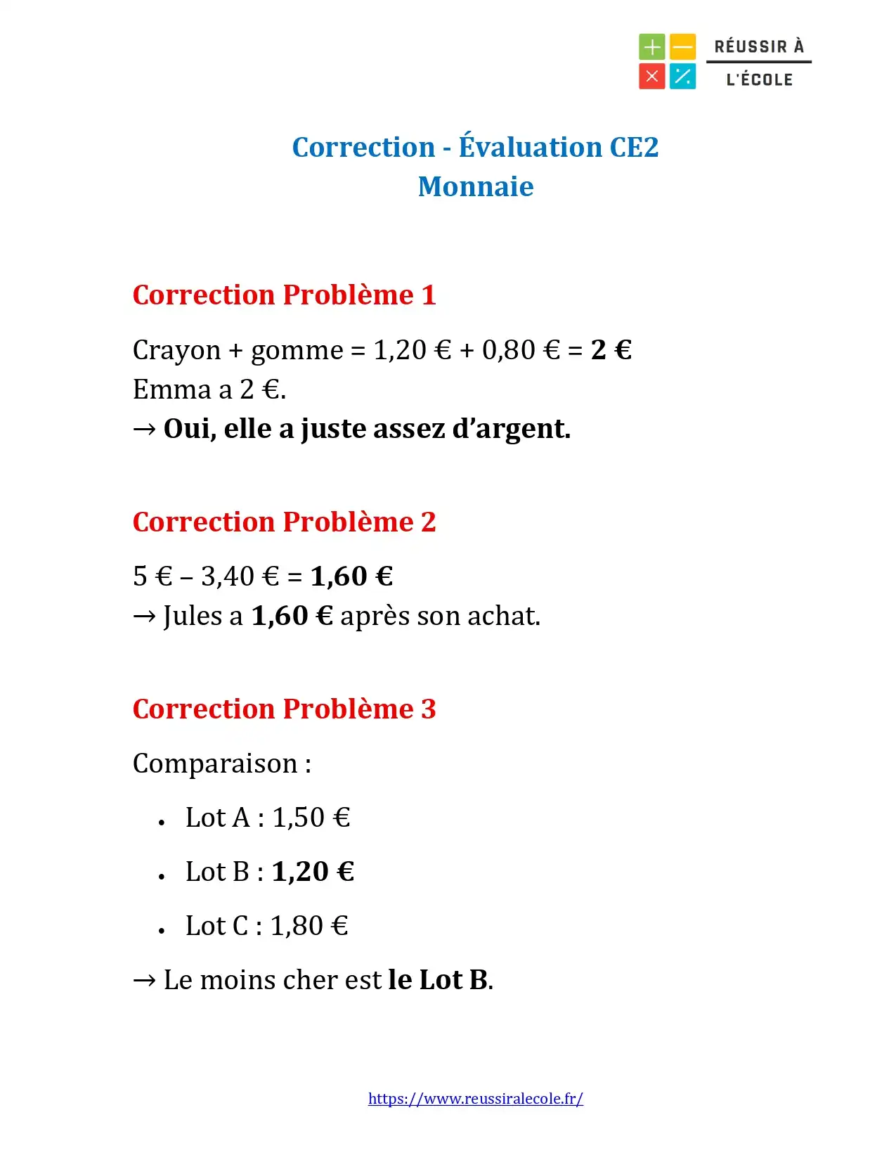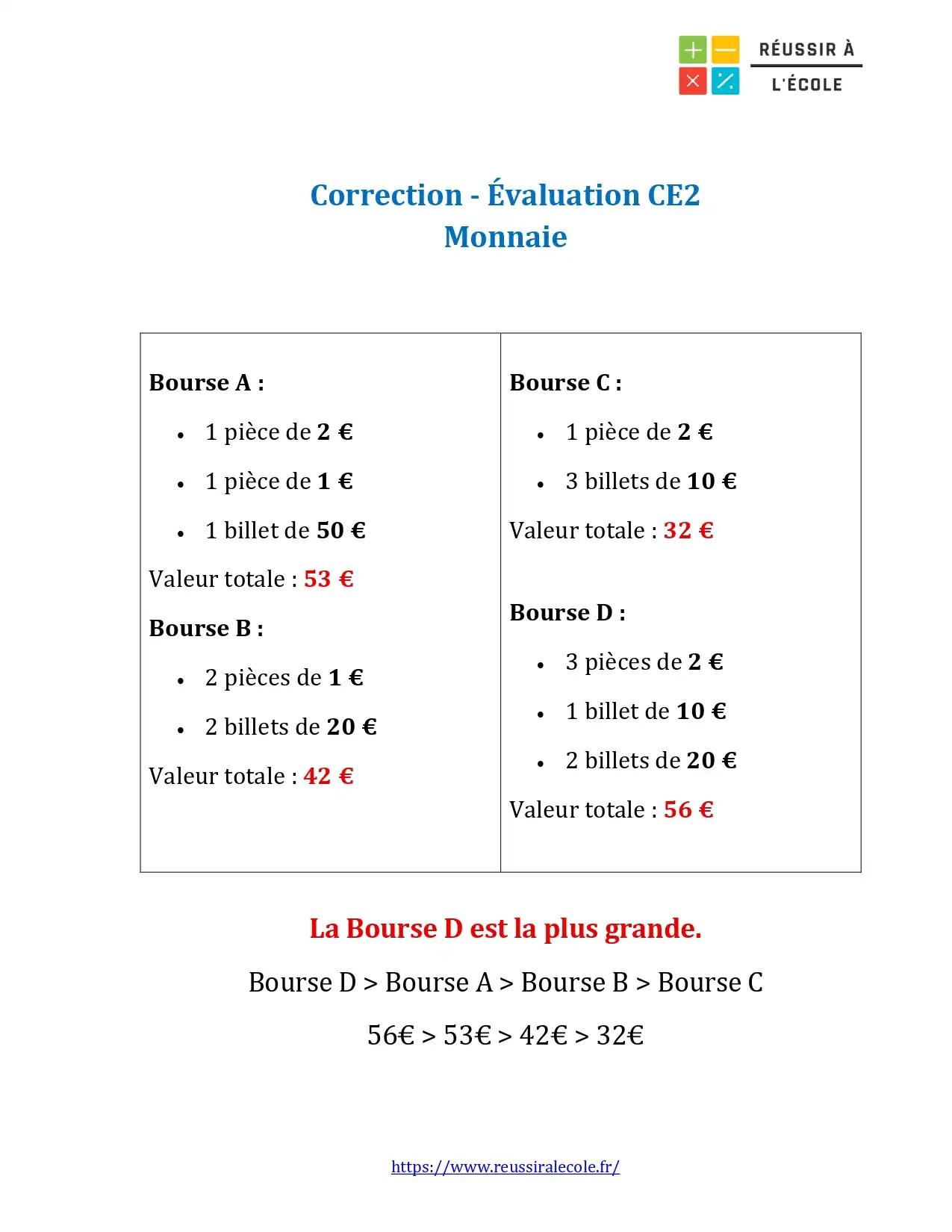 Evaluation niveau CE2 sur la monnaie – calculer et comparer des sommes