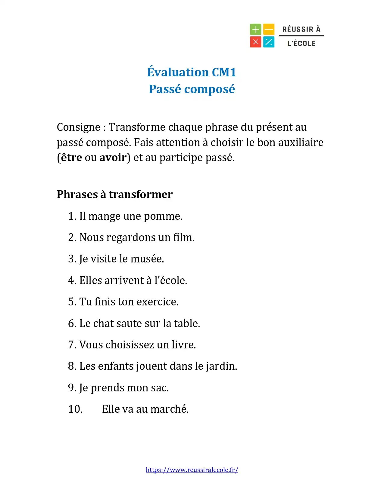 Ce test demande de transformer dix phrases au présent en phrases au passé composé. L’élève doit repérer le verbe, choisir le bon auxiliaire, puis écrire correctement le participe passé. Cette activité mobilise des compétences essentielles : reconnaître un verbe conjugué, choisir entre être et avoir, et appliquer les règles d’accord lorsque cela est nécessaire.