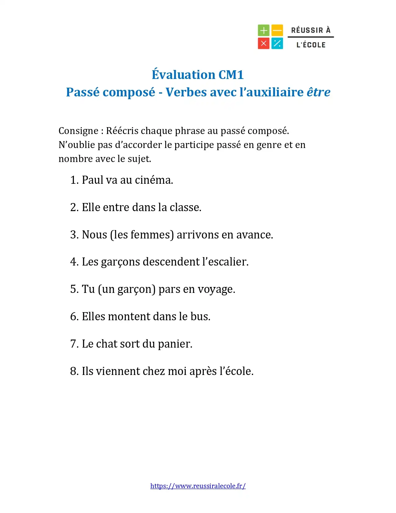 Dans ce troisième chapitre, nous vous proposons une évaluation niveau CM1 consacrée au passé composé des verbes qui se conjuguent avec l’auxiliaire être. Les verbes comme aller, venir, entrer, partir ou descendre nécessitent une attention particulière, car ils impliquent systématiquement l’accord du participe passé avec le sujet.
