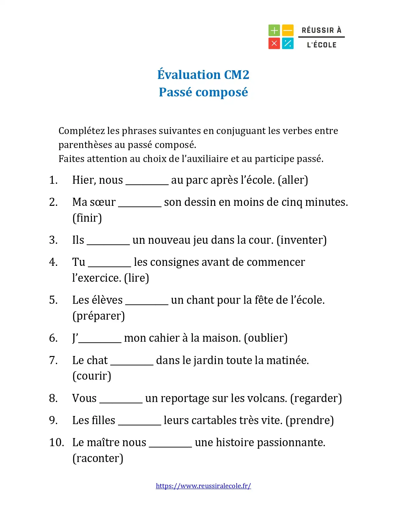 Ce premier test permet de vérifier que les élèves savent identifier les auxiliaires, former correctement le passé composé et conjuguer les verbes les plus fréquents comme aller, finir ou prendre. L’exercice se présente sous la forme de phrases simples à compléter, ce qui permet aux élèves de réinvestir la structure du temps sans difficulté excessive.