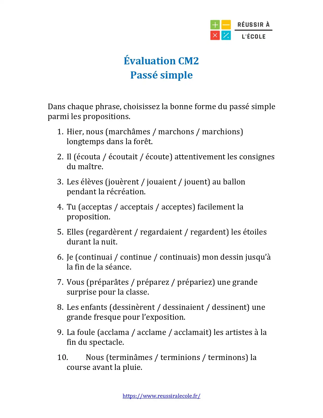 Cette evaluation niveau CM2 sur le passé simple propose un ensemble de verbes à conjuguer dans plusieurs phrases où l’élève doit choisir la bonne terminaison parmi différentes possibilités. Grâce à cette mise en situation, l’enfant renforce sa maîtrise des terminaisons typiques du premier groupe et apprend à repérer rapidement les marques du passé simple.