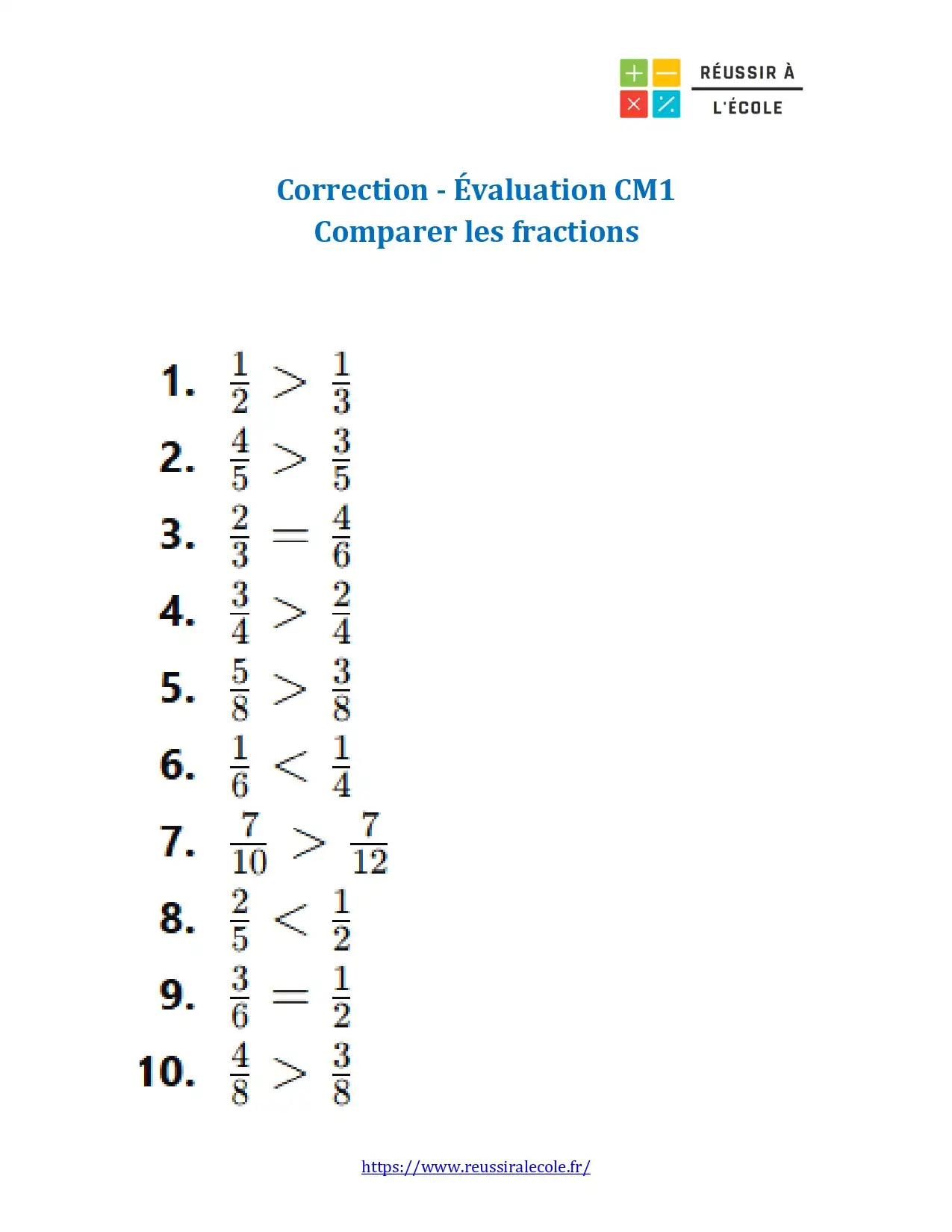 Cet exercice est très utile pour travailler la notion de grandeur. Les élèves comprennent que le numérateur et le dénominateur jouent chacun un rôle dans la comparaison. Grâce au corrigé fourni, ils peuvent vérifier leurs réponses et comprendre leurs éventuelles erreurs. Cette evaluation niveau CM1 sur la fraction permet un apprentissage progressif, rassurant et idéal pour les élèves qui commencent à manipuler des fractions plus complexes.