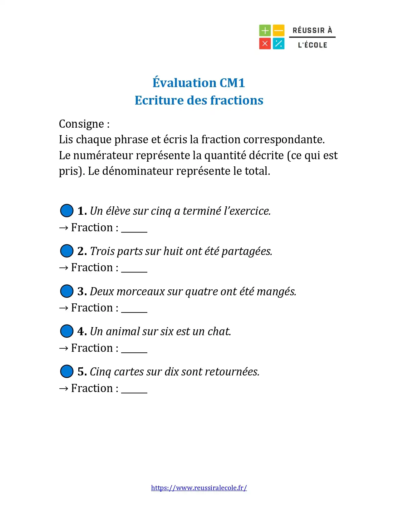 Dans ce dernier chapitre, vous pourrez télécharger une fiche d’évaluation niveau CM1 consacrée à l’écriture de fractions à partir de descriptions concrètes. L’exercice consiste à transformer cinq petites phrases en fractions.