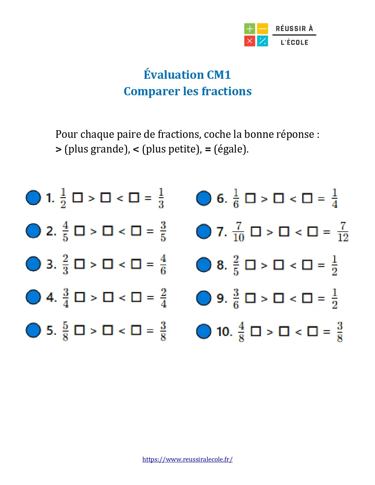 Dans ce deuxième chapitre, vous pourrez télécharger un exercice PDF accompagné d’un corrigé complet. L’évaluation niveau CM1 sur la fraction consiste à comparer des fractions simples entre elles. Pour chaque paire de fractions, l’élève doit cocher si la première est plus grande, plus petite ou égale à la seconde.