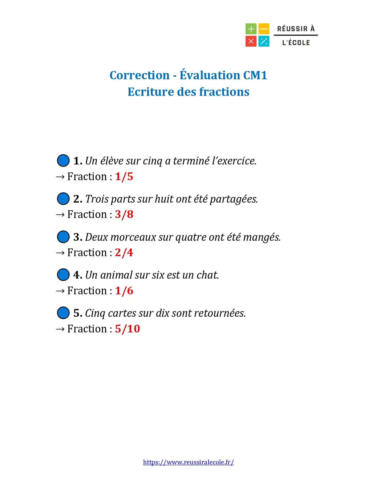 Dans ce dernier chapitre, vous pourrez télécharger une fiche d’évaluation niveau CM1 consacrée à l’écriture de fractions à partir de descriptions concrètes. L’exercice consiste à transformer cinq petites phrases en fractions.