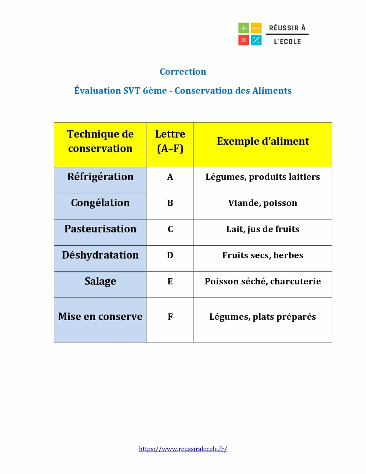 Évaluation SVT 6ème Conservation des Aliments PDF