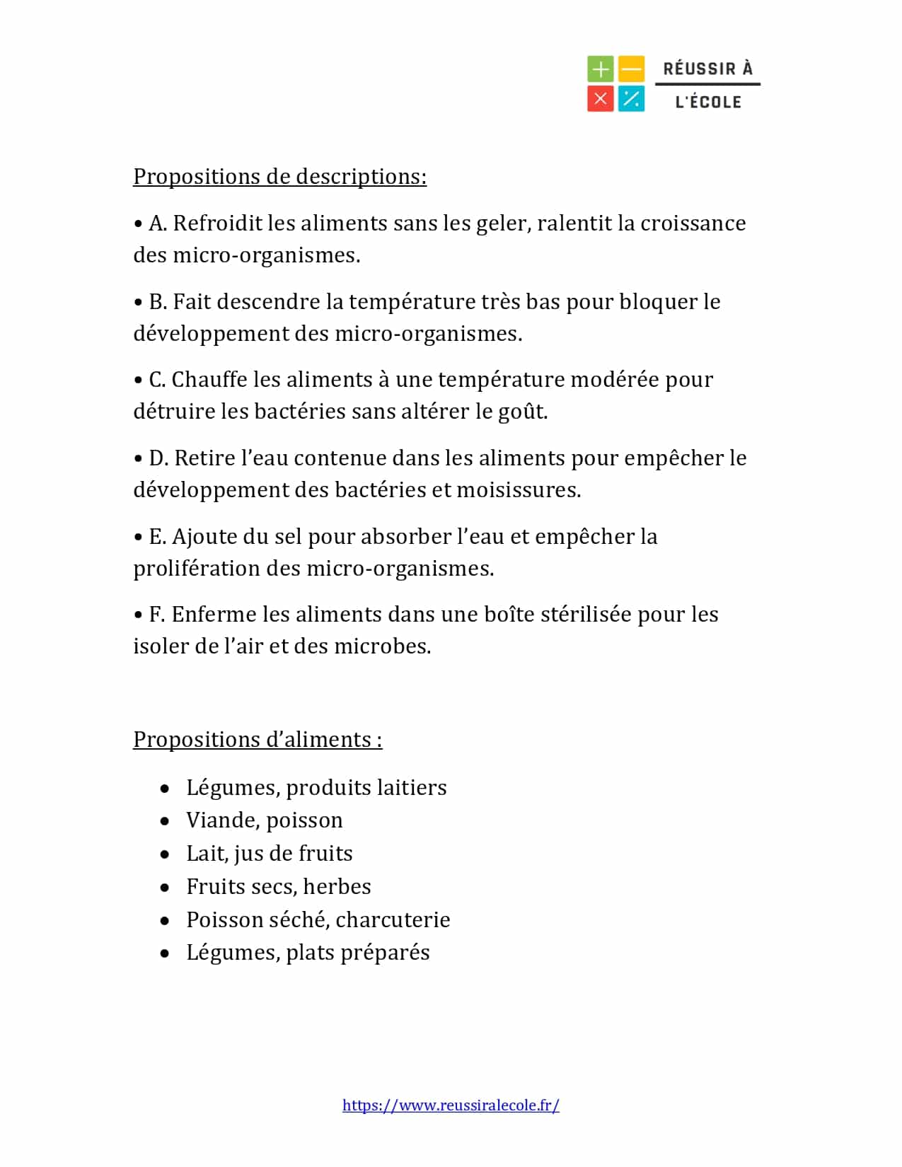 Sur la fiche, plusieurs méthodes de conservation sont présentées : réfrigération, congélation, pasteurisation, salage, mise en conserve ou encore déshydratation. L’élève doit relier chaque technique à sa description et indiquer dans quel cas elle est utilisée.