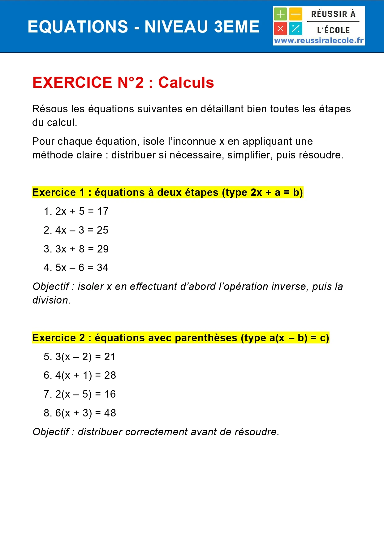 Les exercices proposés prennent la forme d’équations telles que 2x + 5 = 17 ou encore 3(x – 2) = 21. Ici, l’élève apprend à distribuer, simplifier et isoler l’inconnue x en respectant une méthode rigoureuse. Les équations avec parenthèses sont particulièrement importantes en 3eme, car elles préparent aux attentes de la classe de seconde.