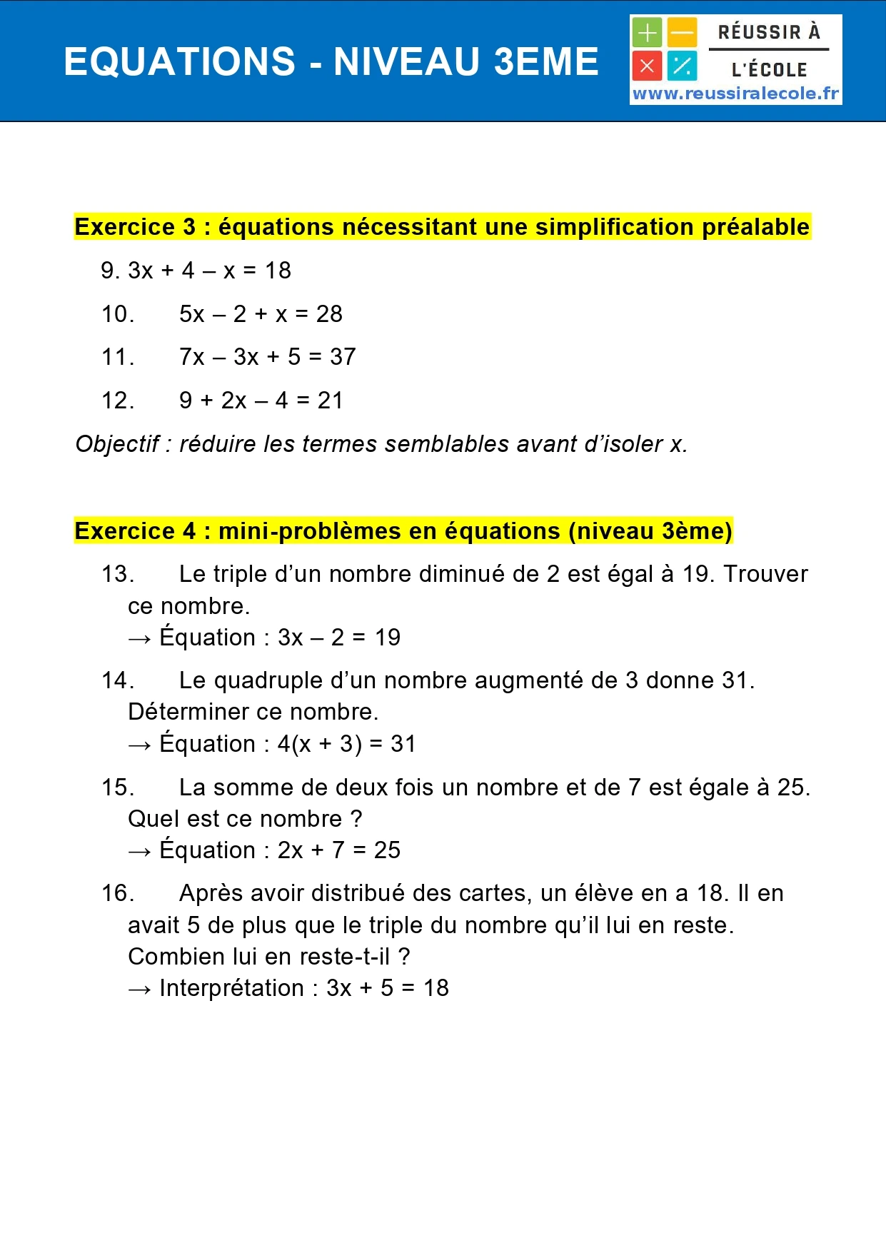 Si vous voulez entraîner un élève de 3ème à résoudre des équations, alors lisez ce qui suit car cette page contient :