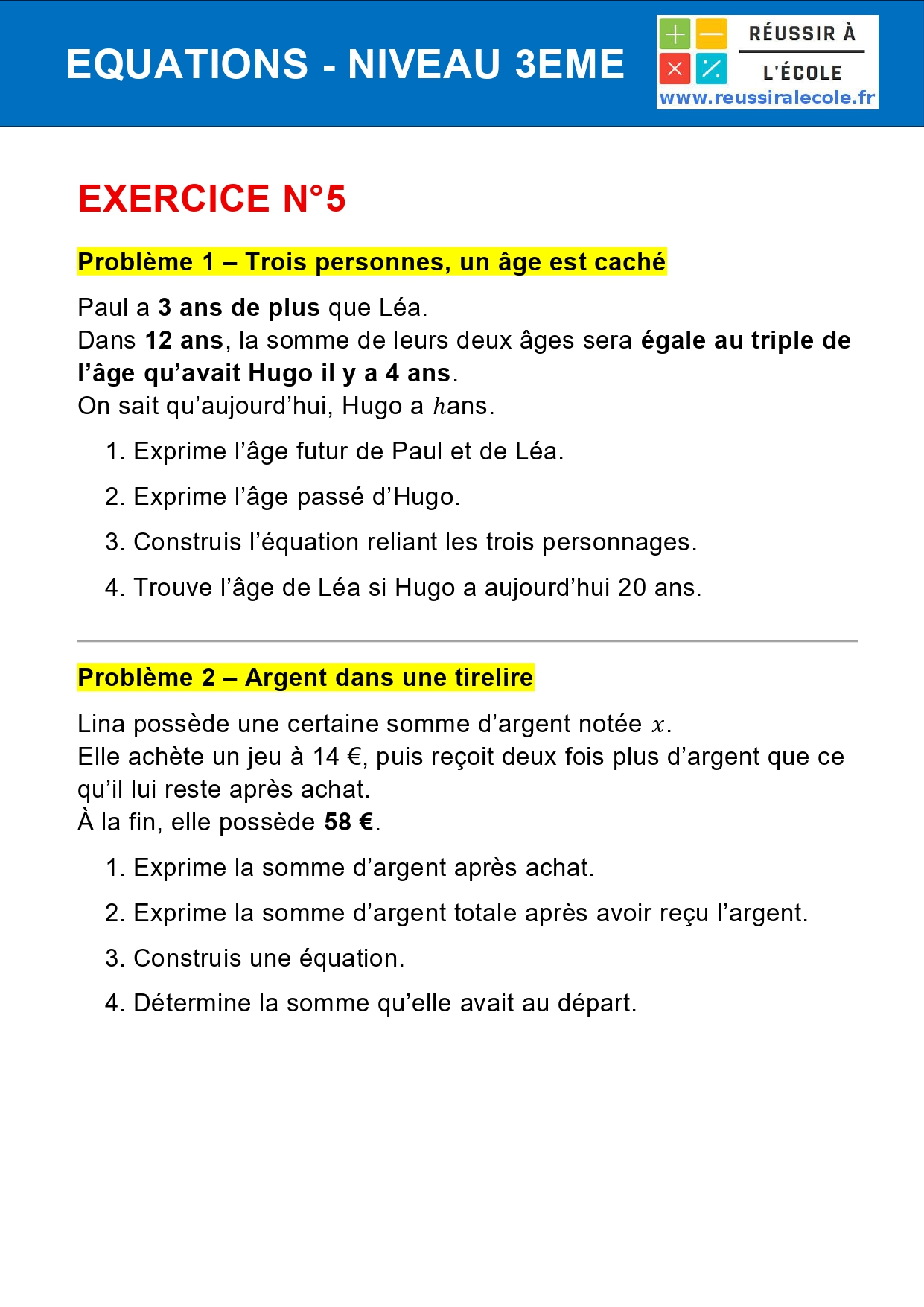 L’exercice niveau 3eme présenté porte sur des équations du type a + x = b ou x – a = b. Par exemple, l’élève doit déterminer un prix manquant ou une longueur inconnue en s’appuyant sur une équation très simple. Ce type d exercice niveau 3eme aide à comprendre que l equation est un outil permettant de traduire une situation concrète sous forme mathématique.