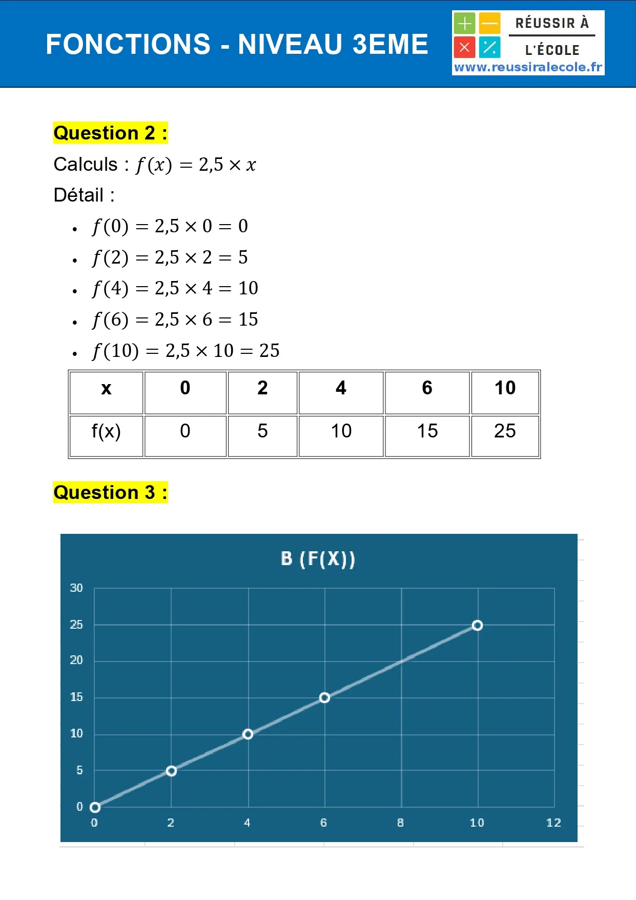 Dans ce deuxième chapitre, nous vous proposons un exercice sur les fonctions 3eme centré sur la réalisation et l’interprétation d’un tableau de valeurs. Le deuxième test permet de comprendre comment une fonction peut être décrite de manière numérique et non plus seulement graphique.
