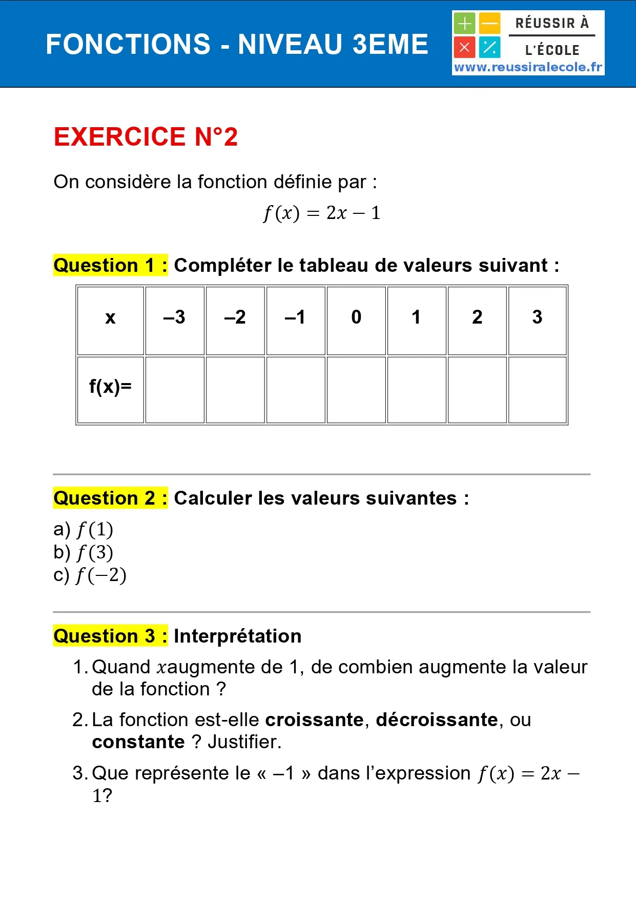 L’exercice consiste à remplir un tableau de valeurs d’après une règle donnée, puis à commenter les résultats obtenus. Par exemple, la fonction peut être définie par f(x) = 2x – 1 ou par une expression différente selon les besoins pédagogiques. L’élève doit alors calculer f(1), f(3), f(–2) et compléter le tableau.