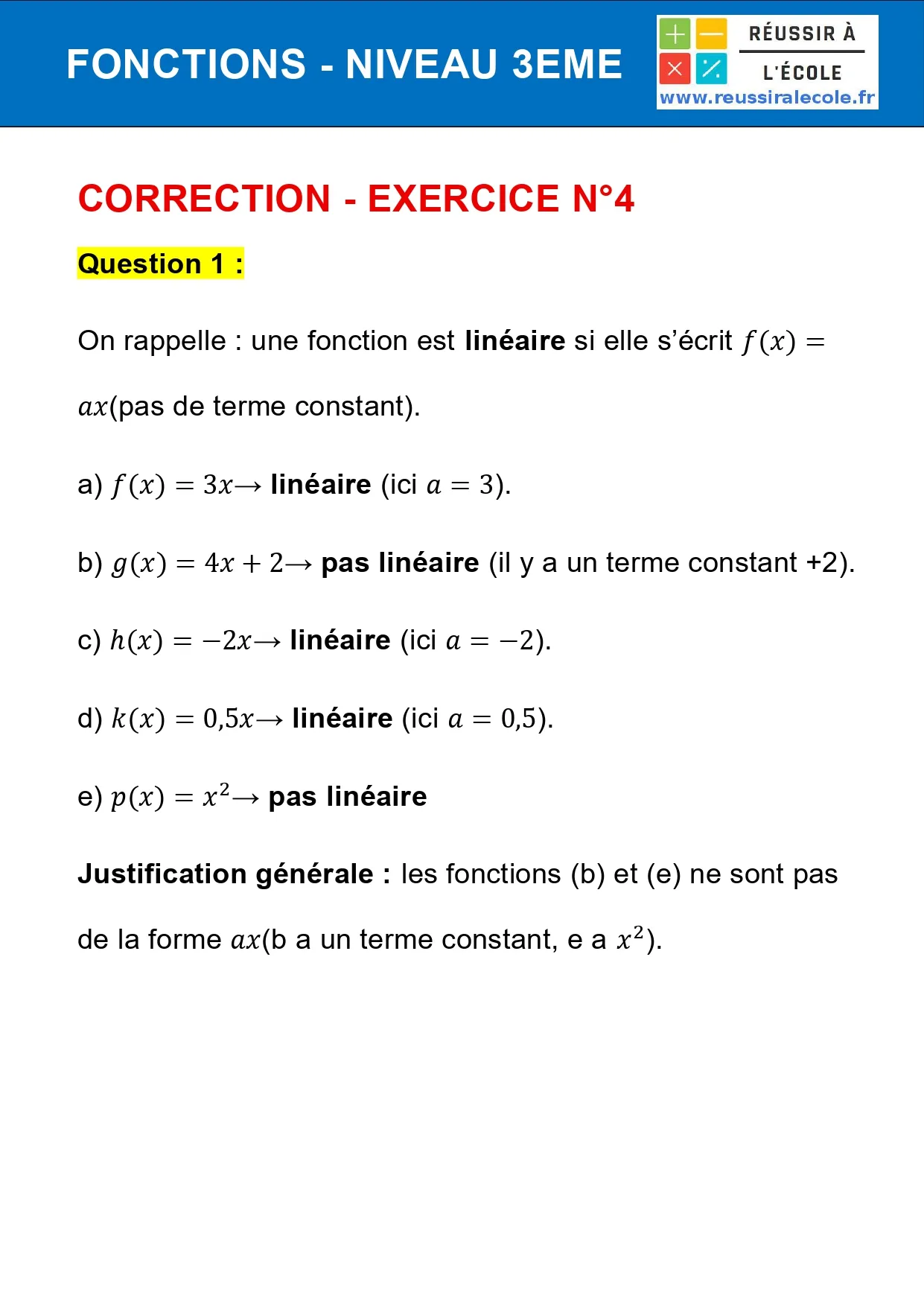 Cet exercice niveau 3ème propose plusieurs exemples de fonctions et l’élève doit dire lesquelles sont linéaires. Ensuite, un tableau de proportionnalité est fourni et l’élève doit compléter les valeurs manquantes avant de tracer la représentation graphique. Pour finir, une question demande de vérifier que la fonction passe par l’origine, critère indispensable pour une fonction linéaire.