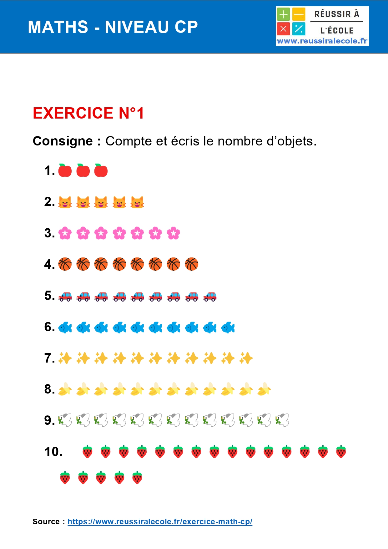 Cet exercice de maths pour CP permet aux élèves de s’entraîner à compter et reconnaître les nombres jusqu’à 20 de manière simple et ludique. L’objectif est de consolider les bases essentielles en mathématiques, en apprenant à relier chaque quantité à son écriture chiffrée. L’enfant observe une série d’objets (comme des fruits, des animaux ou des formes) et doit écrire le nombre correspondant.