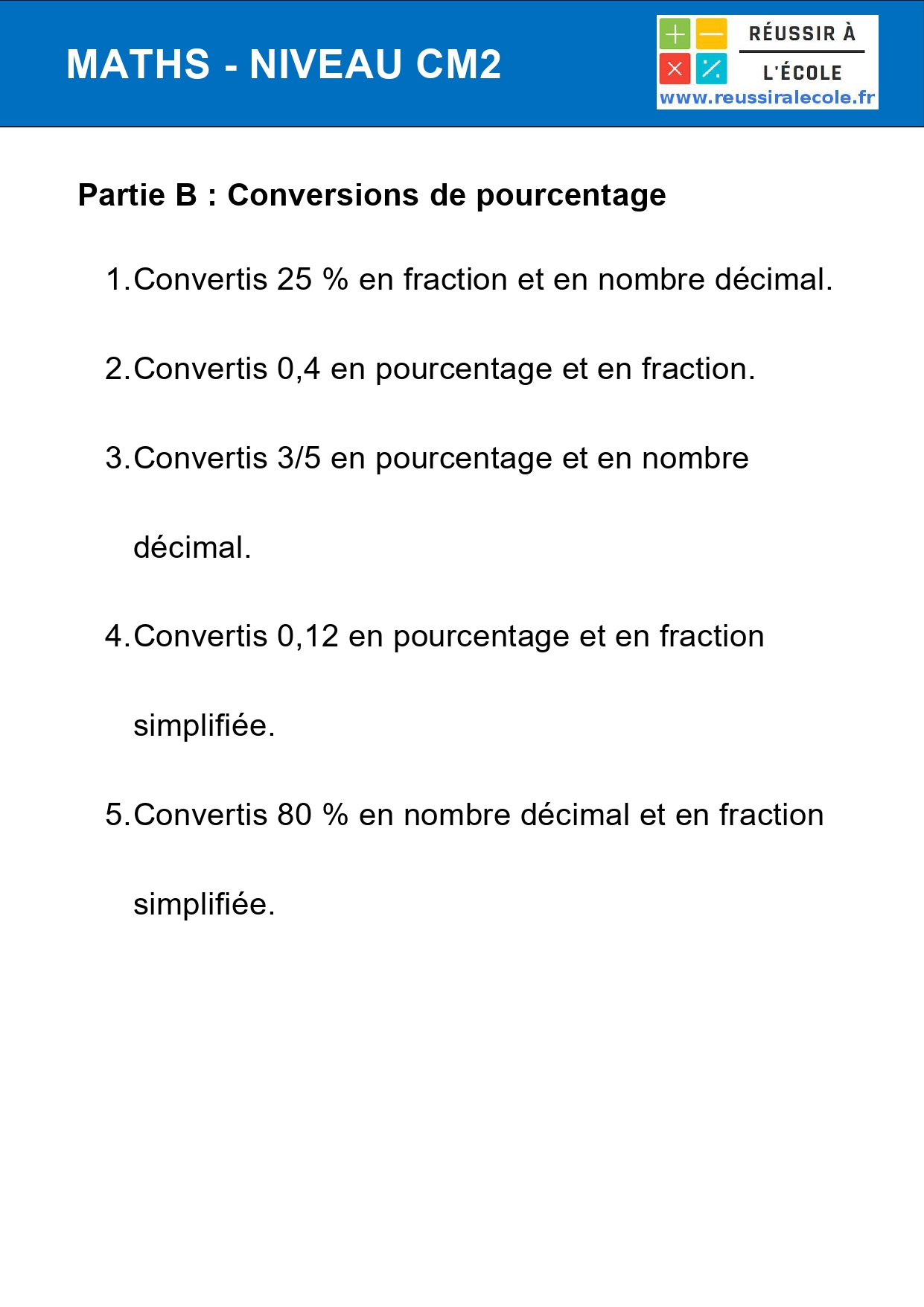La deuxième partie de cette fiche d exercice de maths niveau cm2 se concentre sur les conversions : les élèves transforment des pourcentages en fractions et en nombres décimaux, et inversement. Cela inclut par exemple 25 % à convertir en fraction et décimal, 3/5 à convertir en pourcentage et décimal, ou 0,12 en pourcentage et fraction simplifiée.