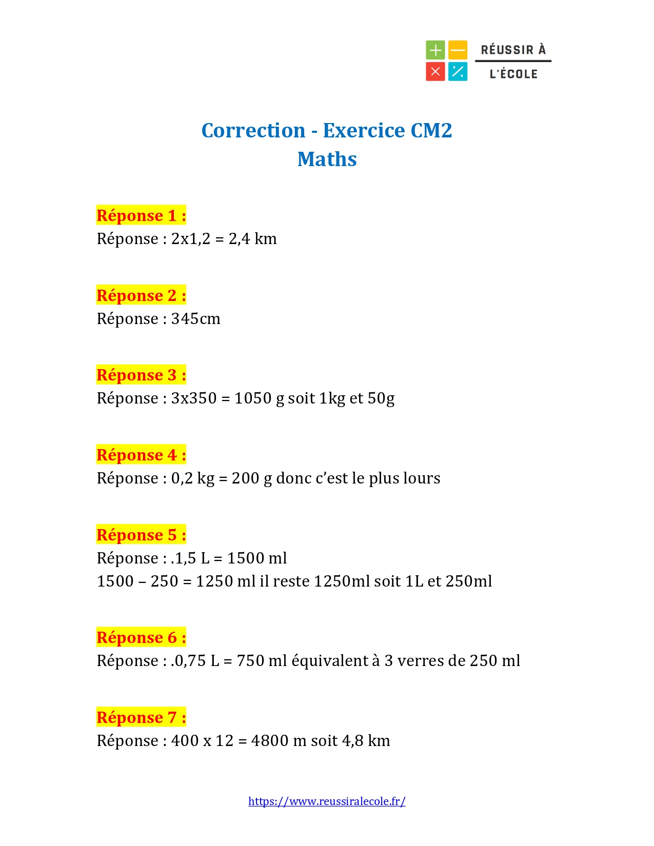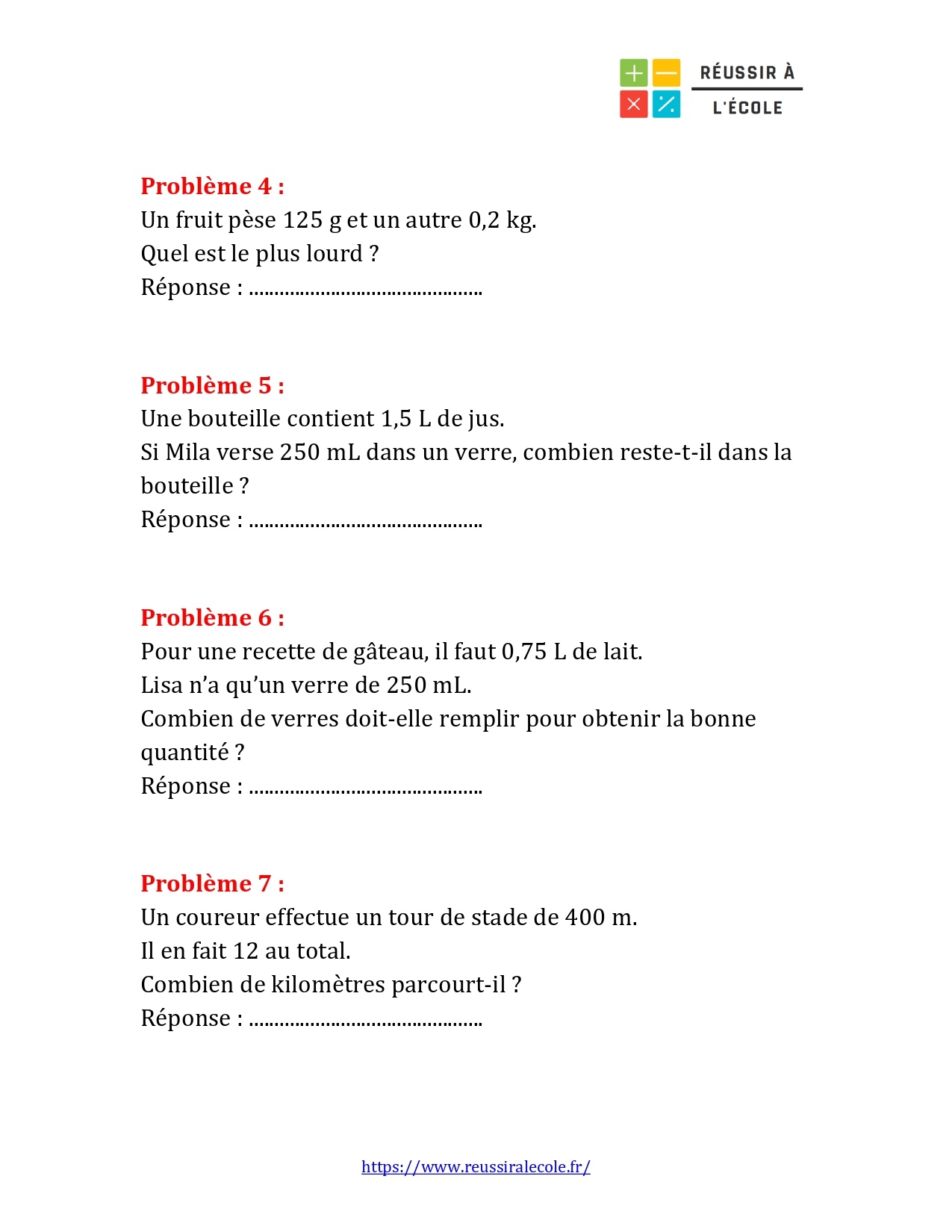 Ce format plaît beaucoup aux élèves, car il leur permet d’appliquer leurs connaissances dans des situations concrètes qu’ils peuvent facilement imaginer : cuisiner, mesurer une distance, comparer des contenances ou encore vérifier une quantité. Le fichier PDF de cet exercice de maths niveau CM2 est disponible au téléchargement avec son corrigé gratuit. Il peut être imprimé pour un devoir en classe, à la maison ou en soutien scolaire.