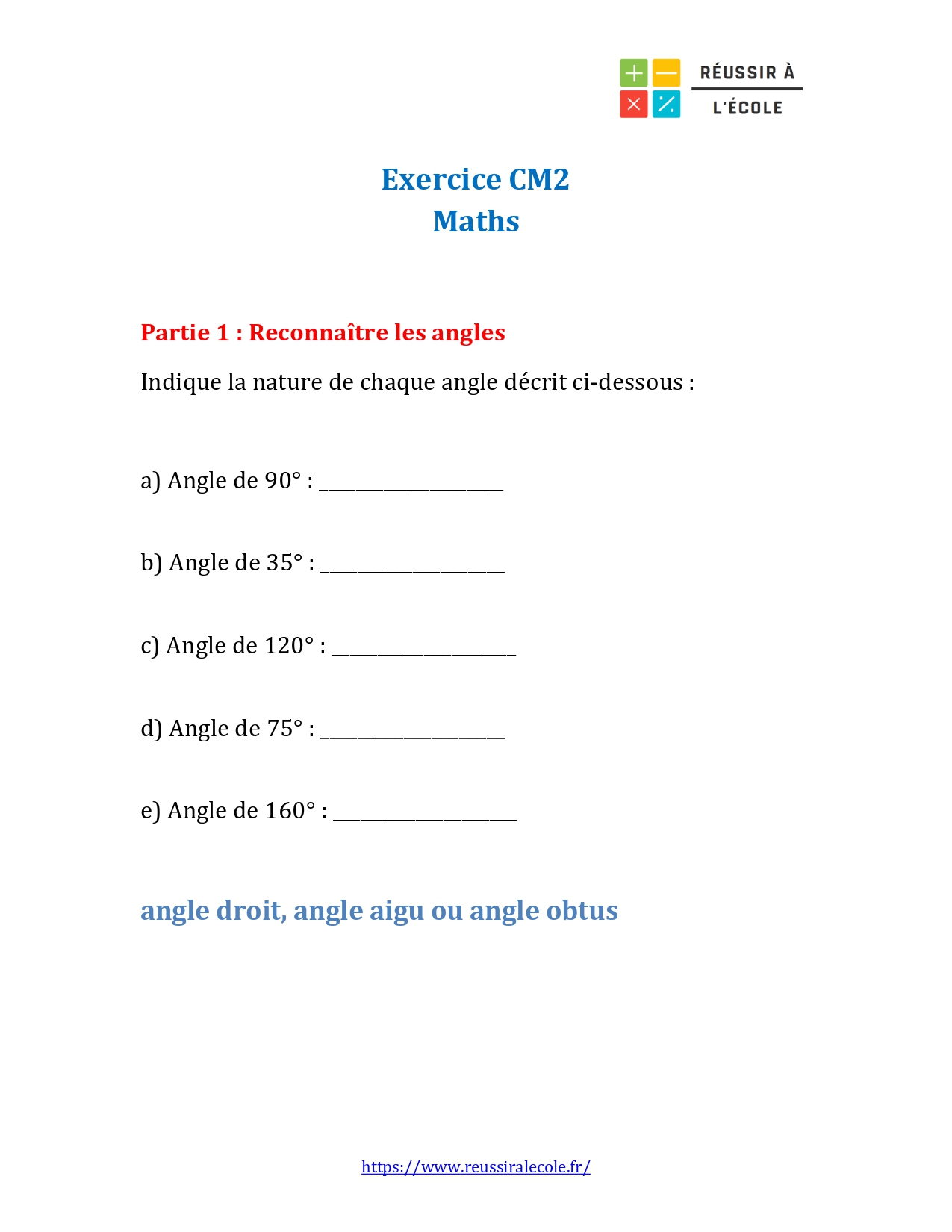 - Un exercice de math niveau CM2 en géométrie, accompagné d’un corrigé PDF gratuit, pour identifier des angles et reconnaître différents types de triangles.