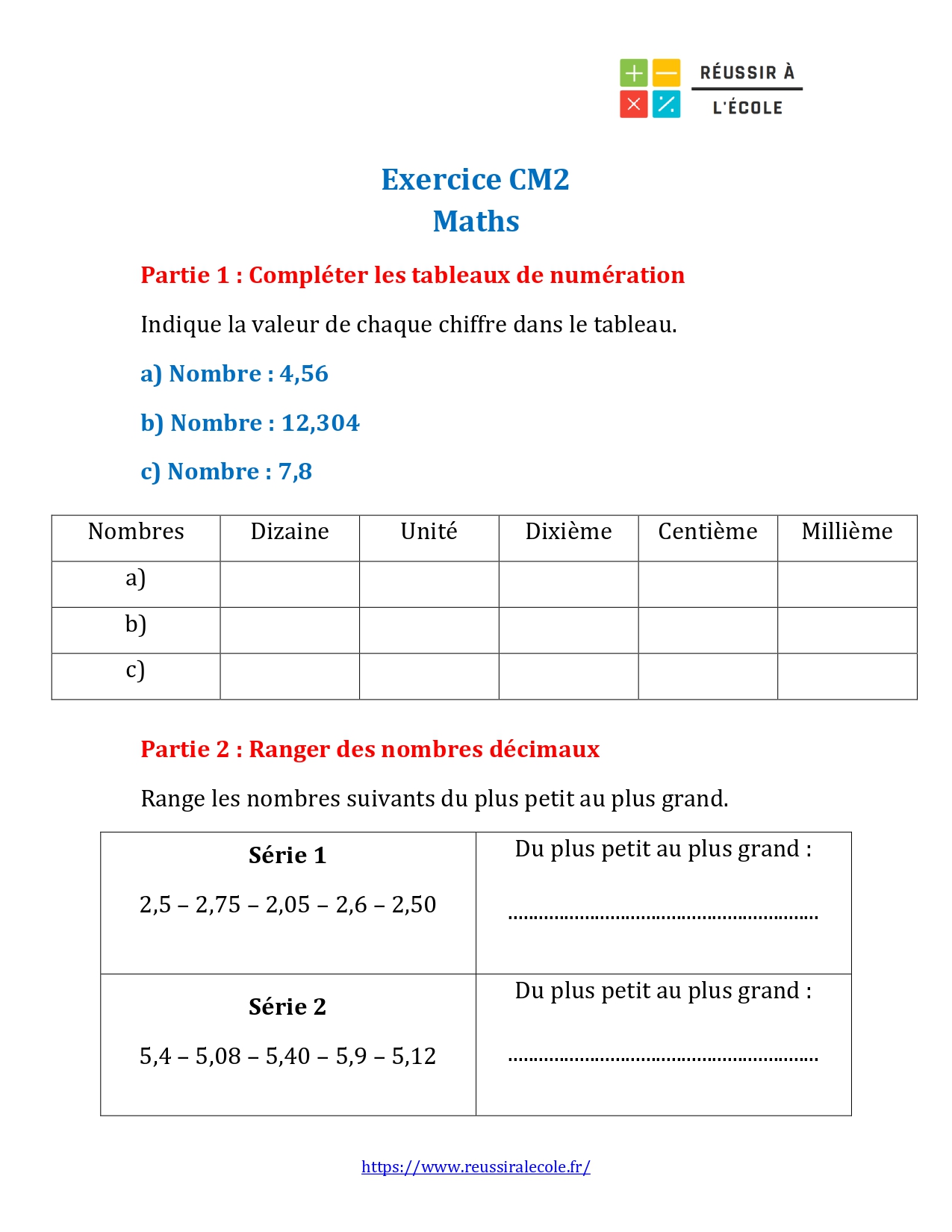 - Une feuille de travail dédiée aux nombres décimaux, incluant tableaux de numération, comparaisons et lecture de droites graduées.