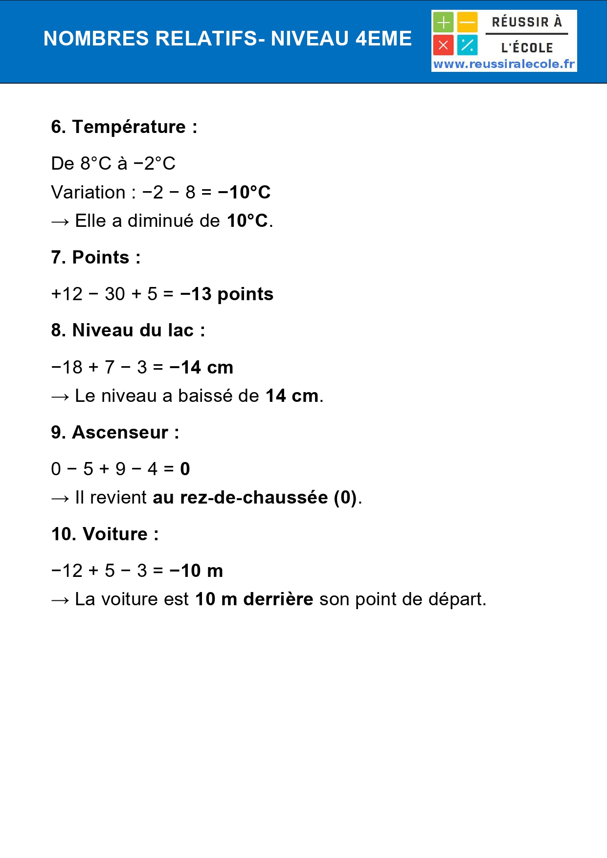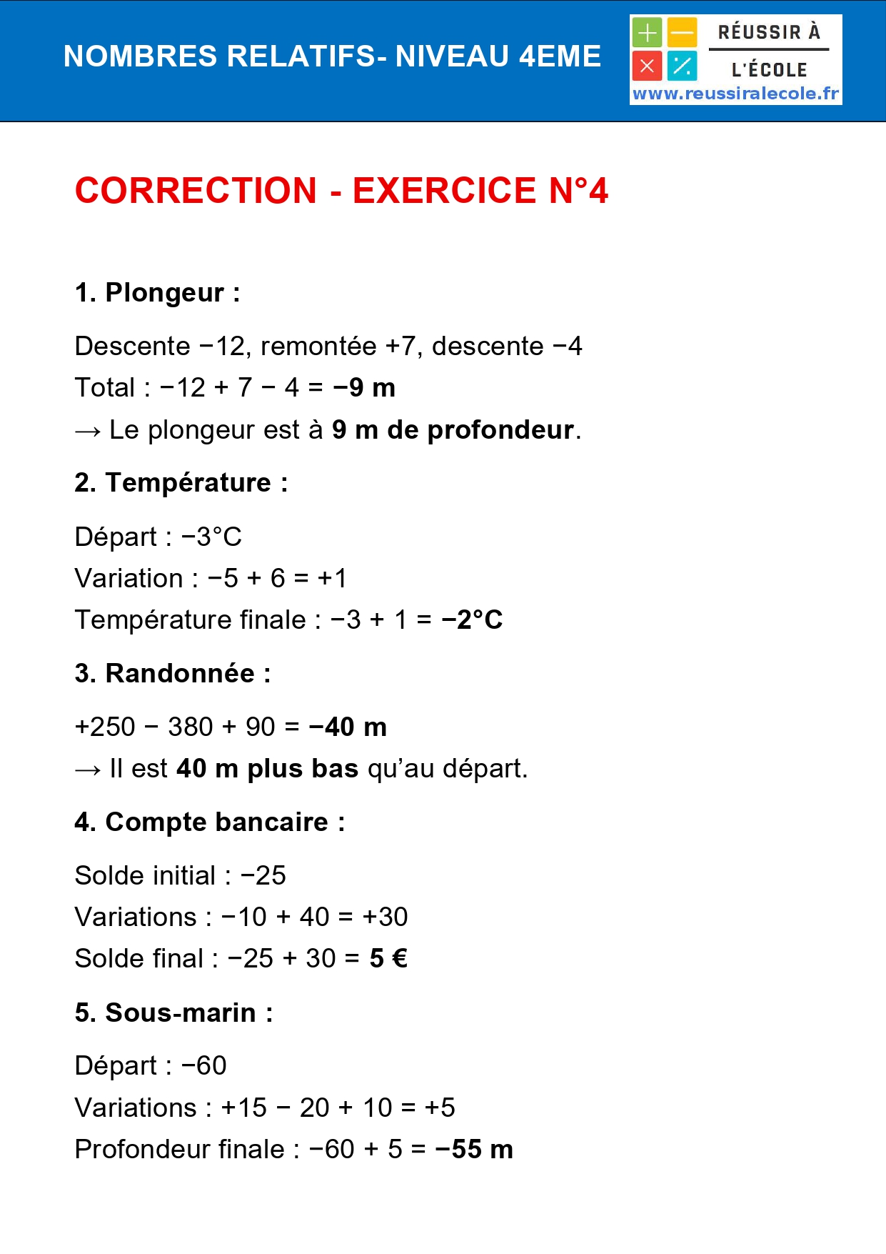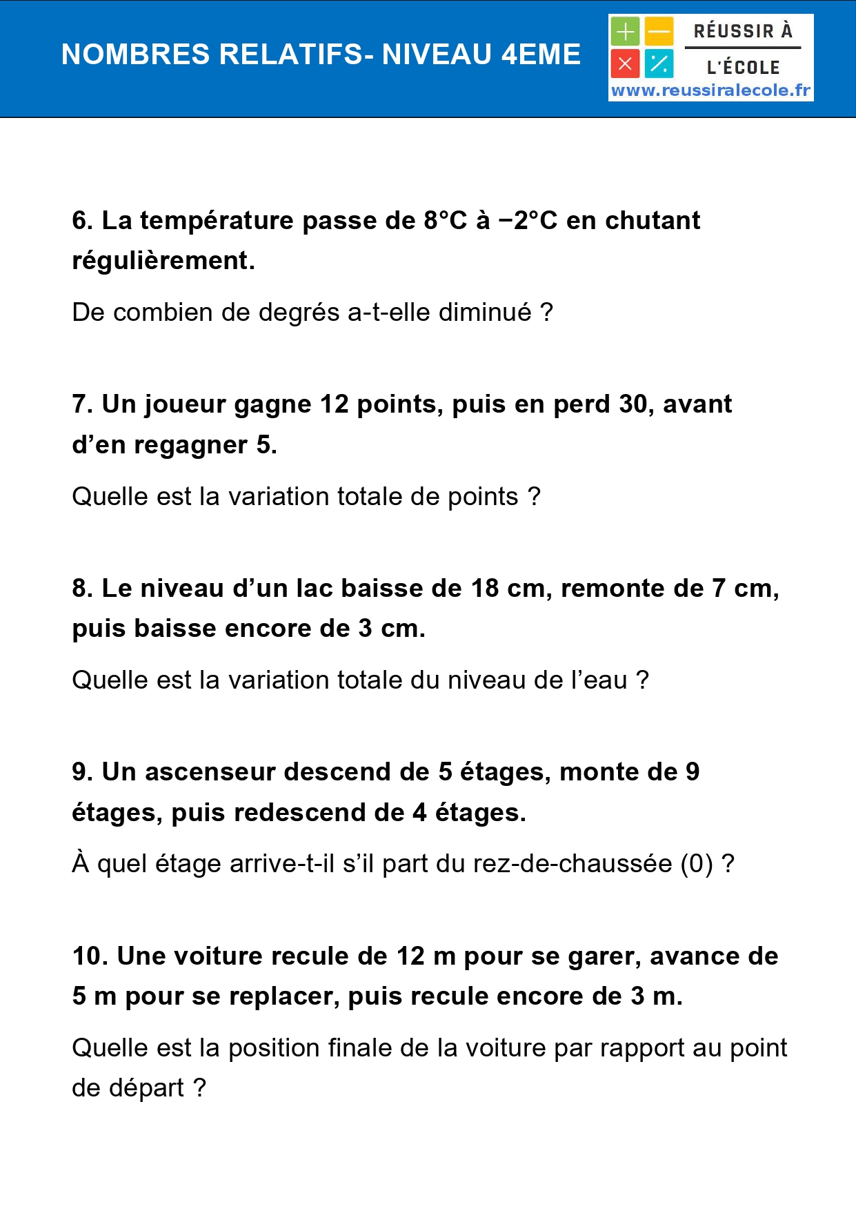 Exemple de situation : un plongeur descend de 12 mètres, remonte de 7 mètres, puis replonge de 4 mètres. À quelle profondeur se trouve-t-il au final ? Ce type de problème aide à comprendre que les nombres relatifs ne sont pas qu’une abstraction mais qu’ils décrivent aussi des mouvements, des variations ou des bilans.
