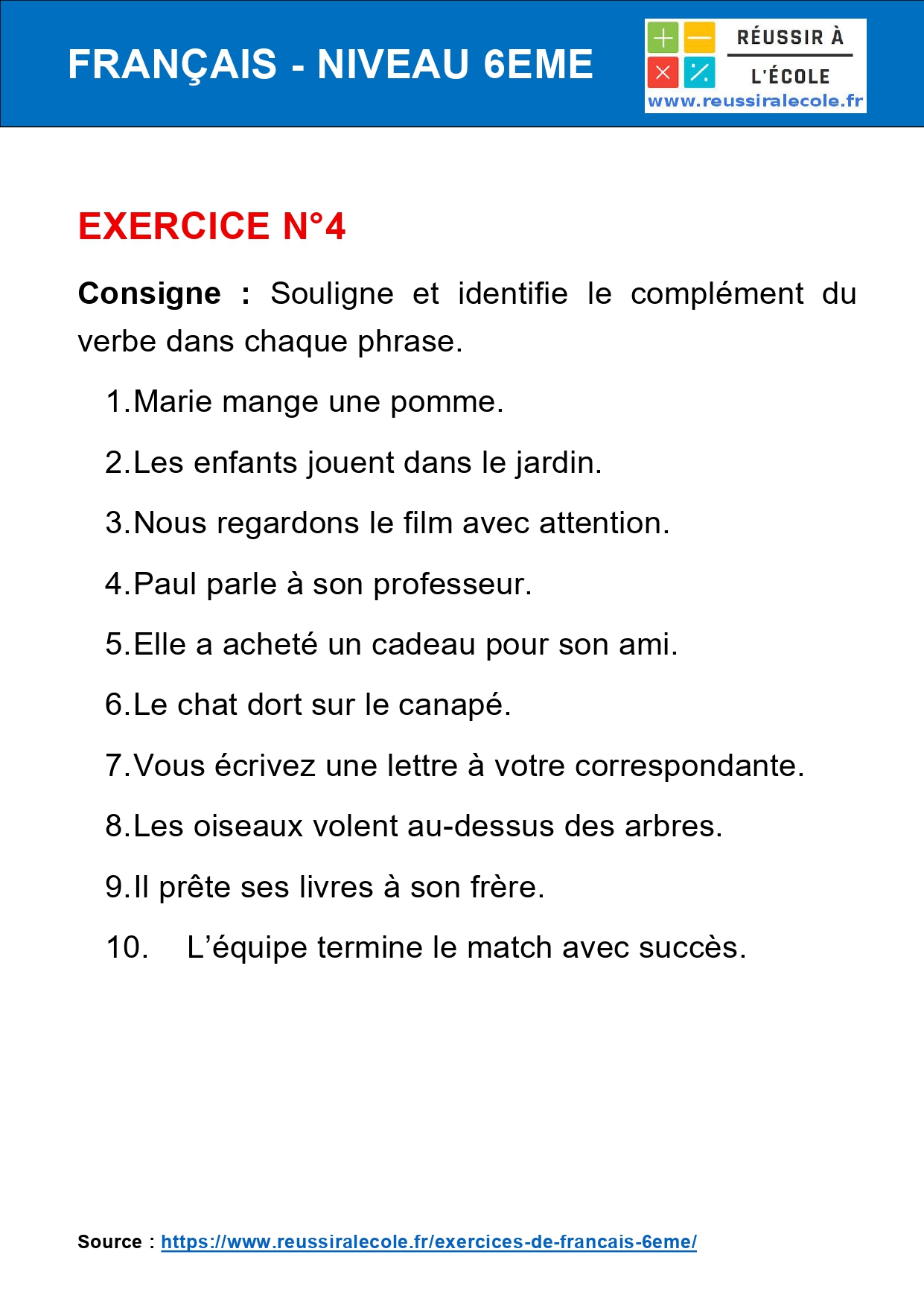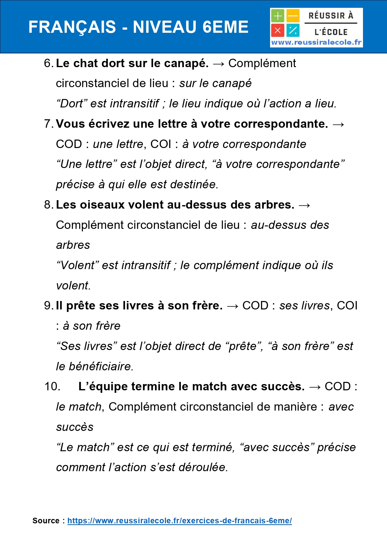 Cet exercice niveau 6ème en français permet aux élèves de repérer le complément du verbe (COD, COI, ou complément circonstanciel) dans chaque phrase. C’est une compétence essentielle pour comprendre la structure des phrases et améliorer la rédaction.