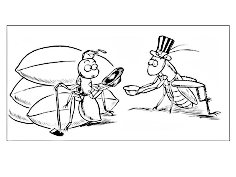 Quand le froid arrive, la Cigale se retrouve démunie et vient demander de l’aide… que la Fourmi refuse.