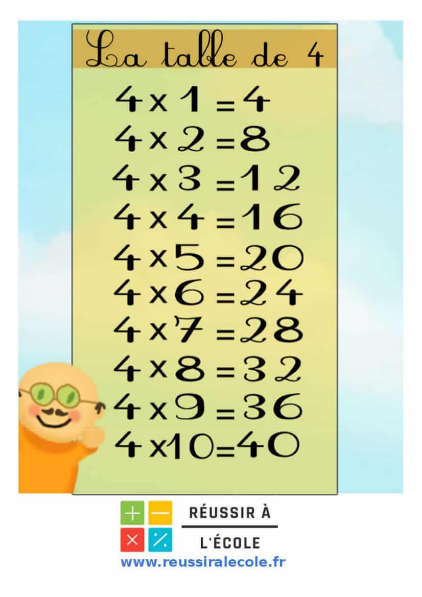 - D’abord, une jolie affiche de la table de multiplication de 4 à imprimer